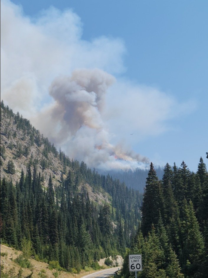State Route 20 is now closed between Newhalem (milepost 120) and the Silver Star Sno Park (milepost 171, where it normally closes for the winter on the east side) due to this fire and the Sourdough Fire west of the pass. Please check https://www.facebook.com/WSDOT for the latest information on highway closures.