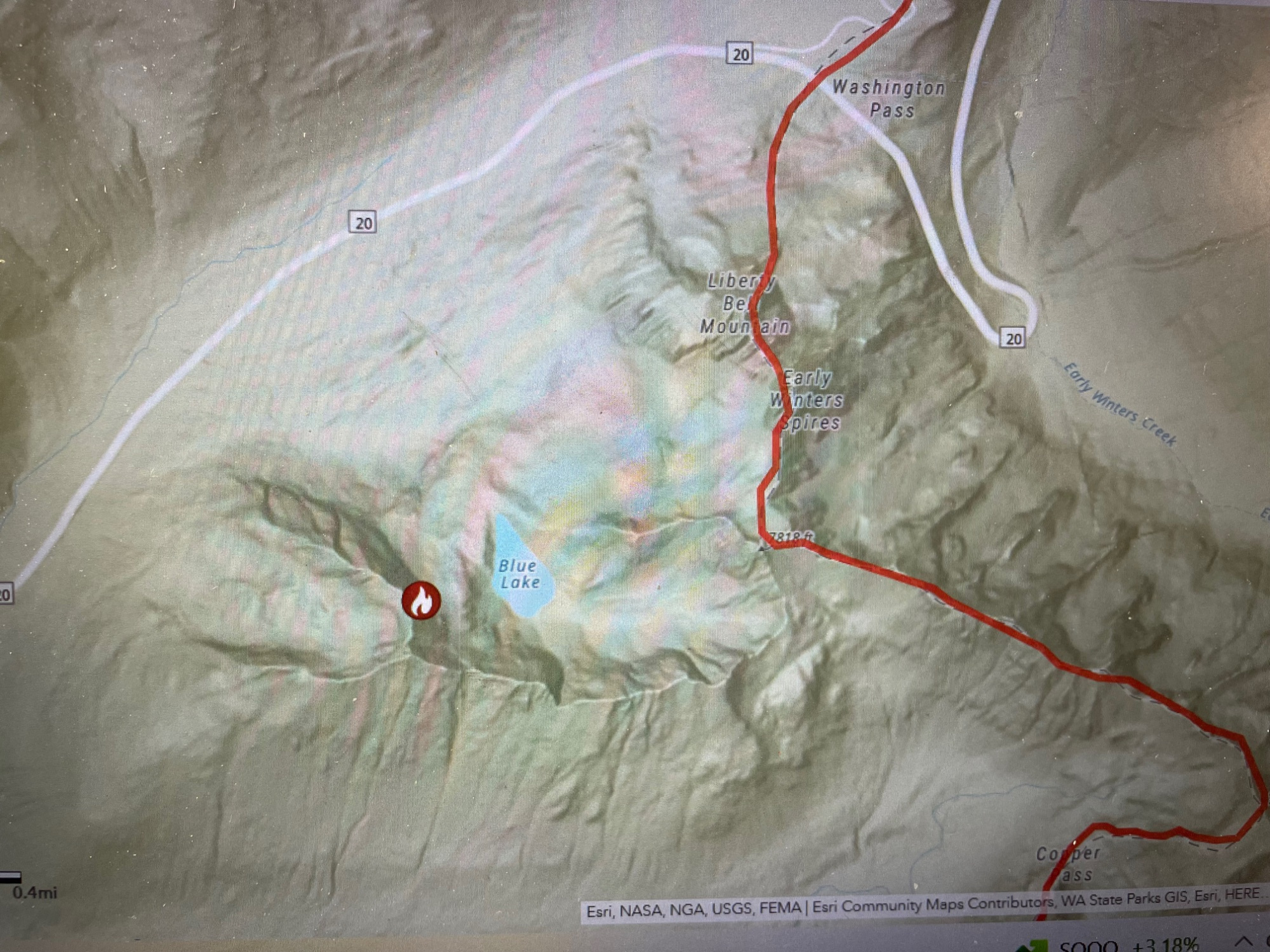 The fire is now estimated to be around 196 acres (reduction in size due to more accurate mapping). The fire is burning just south of State Route 20 and near popular hiking and climbing trails, such as Blue Lake, Heather Maple Pass, and the Pacific Crest Trail near Bridge Creek.