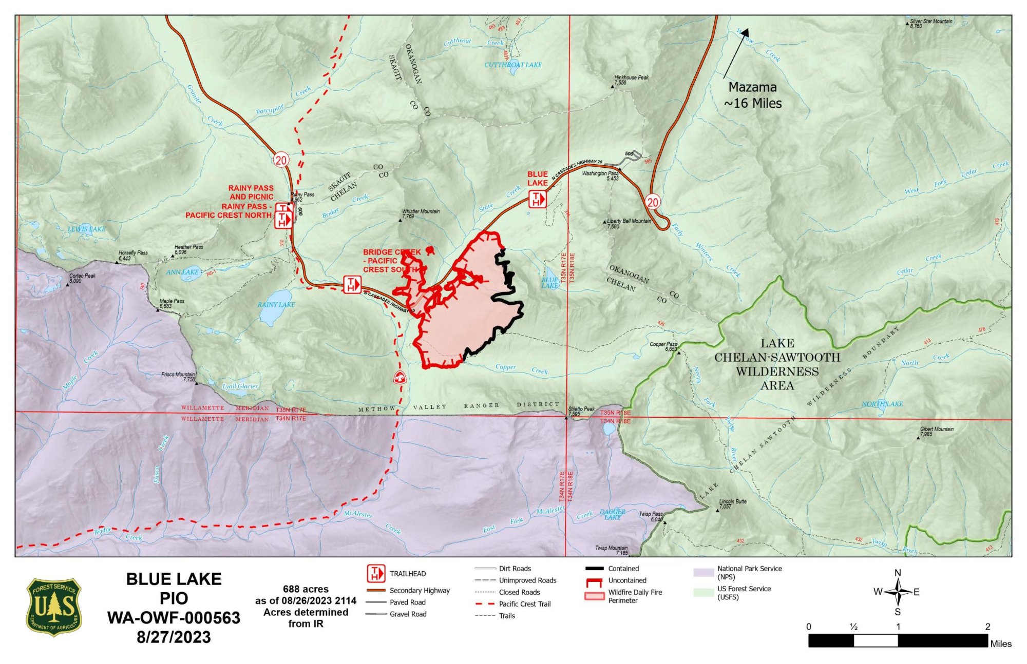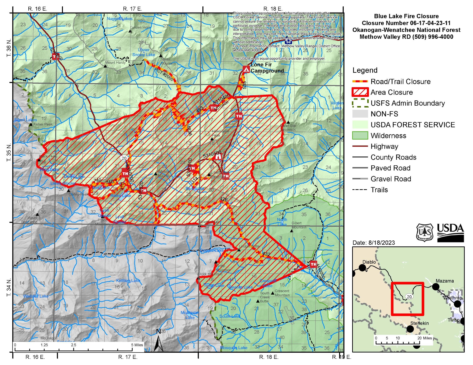 Closures: State Route 20 is closed between Newhalem (milepost 120) and the Silver Star Sno-Park (milepost 171) due to this fire and also the Sourdough Fire west of the pass. Please check with WSDOT for the most current highway closures at https://www.facebook.com/WSDOT. The Pacific Crest Trail is closed through this area. National Park Service closure information is available at https://tinyurl.com/mr3f2dwa. Forest Service closures are in process.
