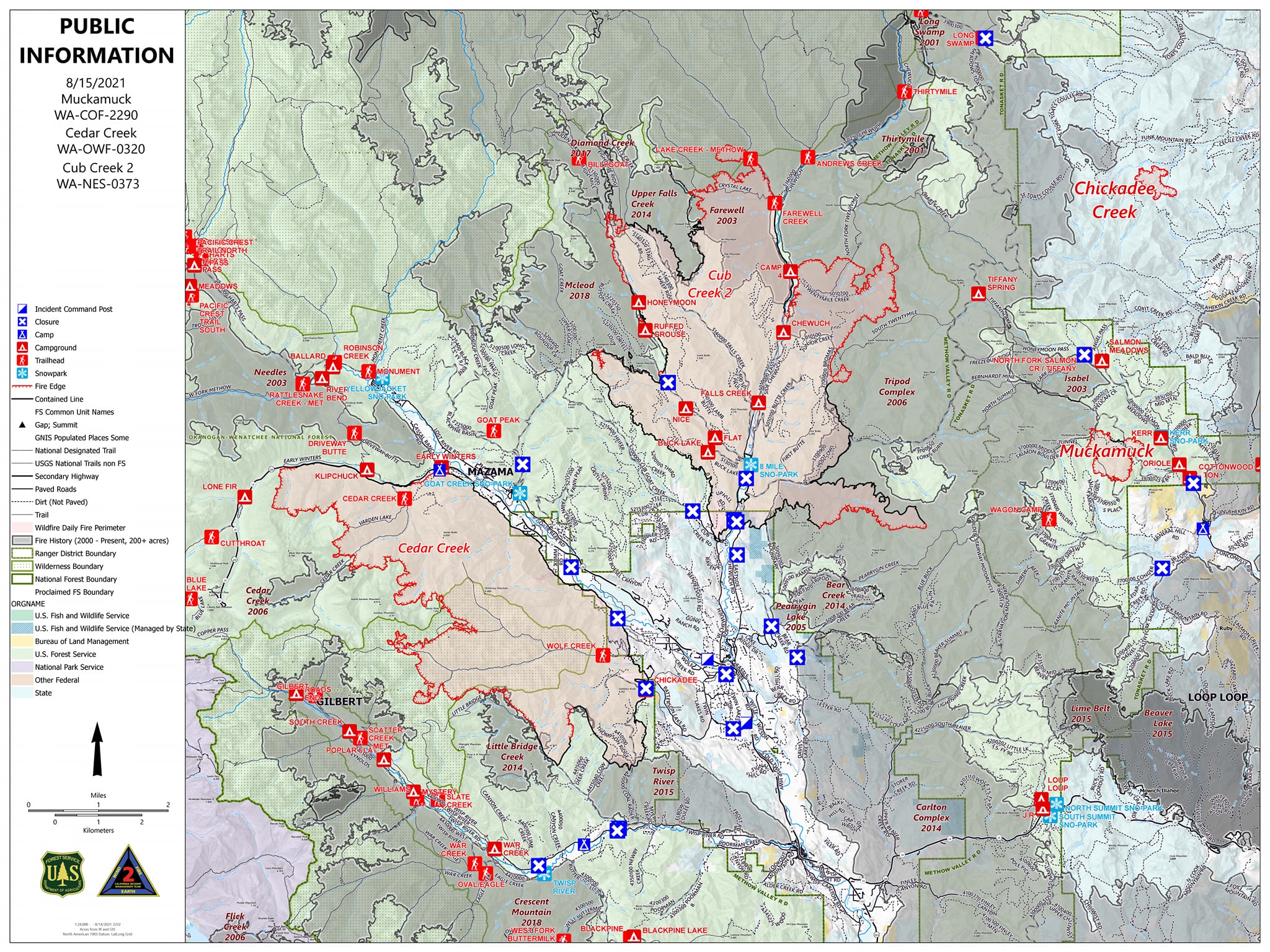 Here is your updated fire map for Sunday, Aug. 15. You will notice that we have combined maps for the Cedar Creek, Cub Creek 2, and Muckamuck fires into one map. Be aware of out-of-towners on the roads heading home today. #muckamuckfire