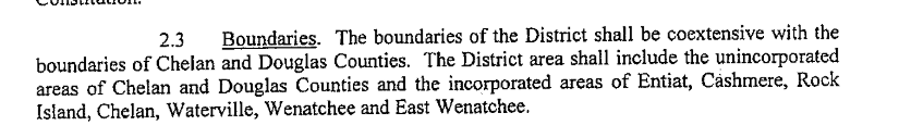"The Greater Wenatchee Regional Events Center Public Facilities District was formed by an Inter-local Agreement between the City of Wenatchee, The City of East Wenatchee, City of Cashmere, City of Entiat, Town of Waterville, City of Chelan, City of Rock Island, Chelan County and Douglas County."