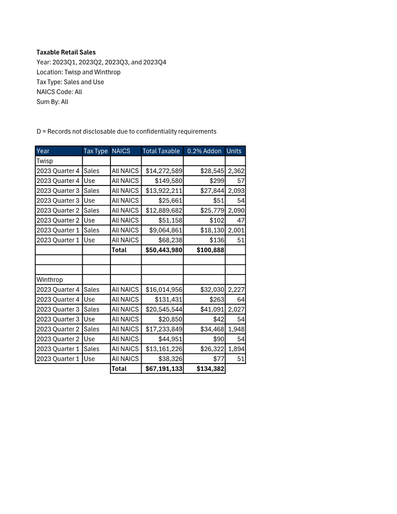 Tax revenues from 0.2% Sales Tax Addon for Twisp & Winthrop... 4 quarters 2023 (most recent available)...