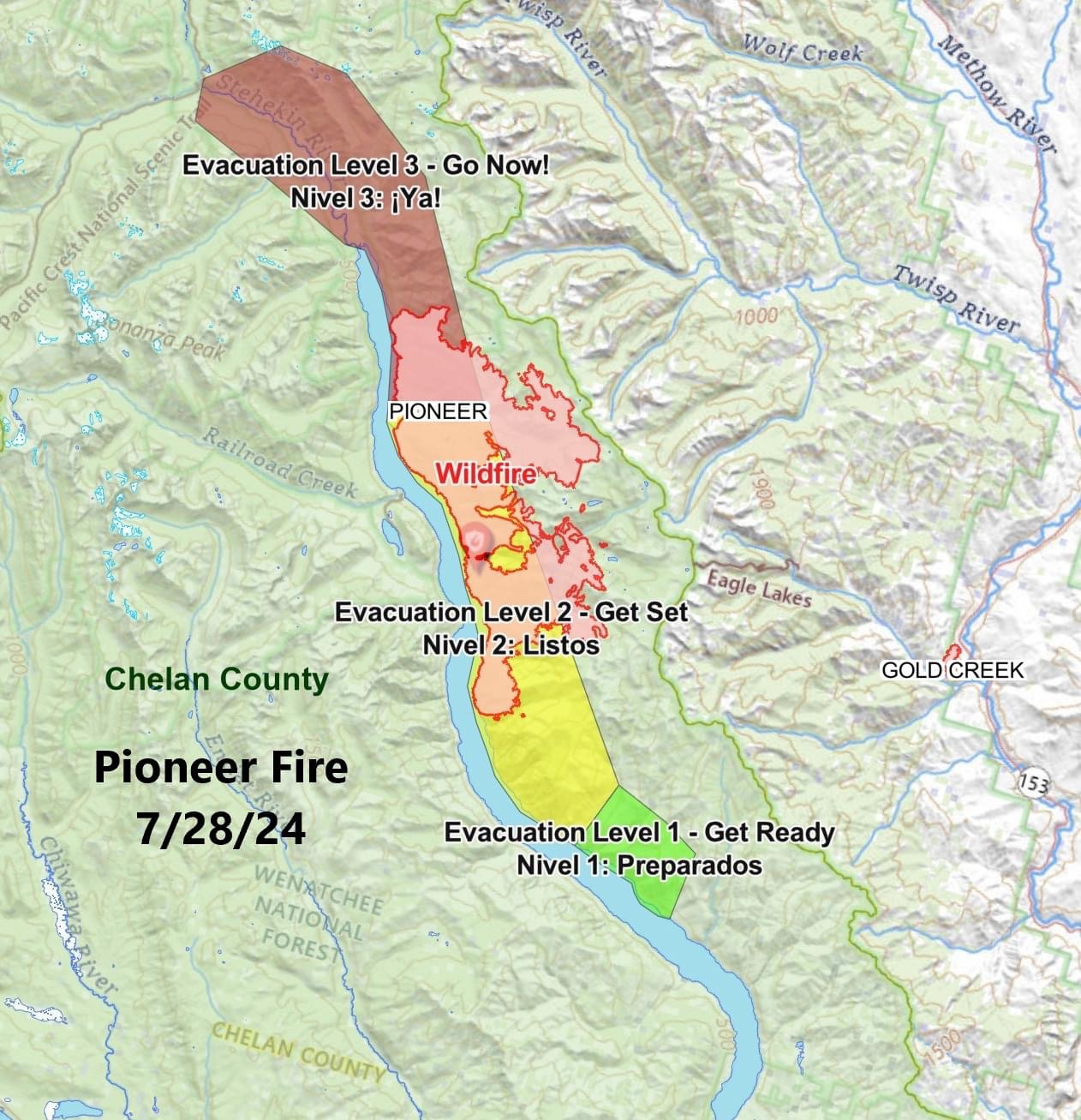 The Pioneer Fire crossed Fourmile drainage yesterday and progressed further north. This fire movement has prompted @Chelan County Emergency Management to issue a Level 3 (Go Now) notice for Stehekin starting July 28 at 8am. For more details about the notice and transport information see https://www.facebook.com/CCSOEM/posts/p ... PUJTBzqTTl
