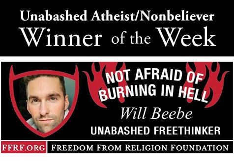 I am not scared of much, but I am afraid of burning in Hell. The image shown below from The Freedom from Religion Foundation, mocks Christians’ fear of burning in Hell. According to their Facebook page, they have a contest for the Unabashed Atheist/Nonbeliever of the week. The virtual billboard shown below has the winner’s photo in a silhouette of the devil and flames. Just look at where our society is headed. It is time, past time, to stand up. So let me be clear, I will not waiver on my stance and Christian beliefs.
