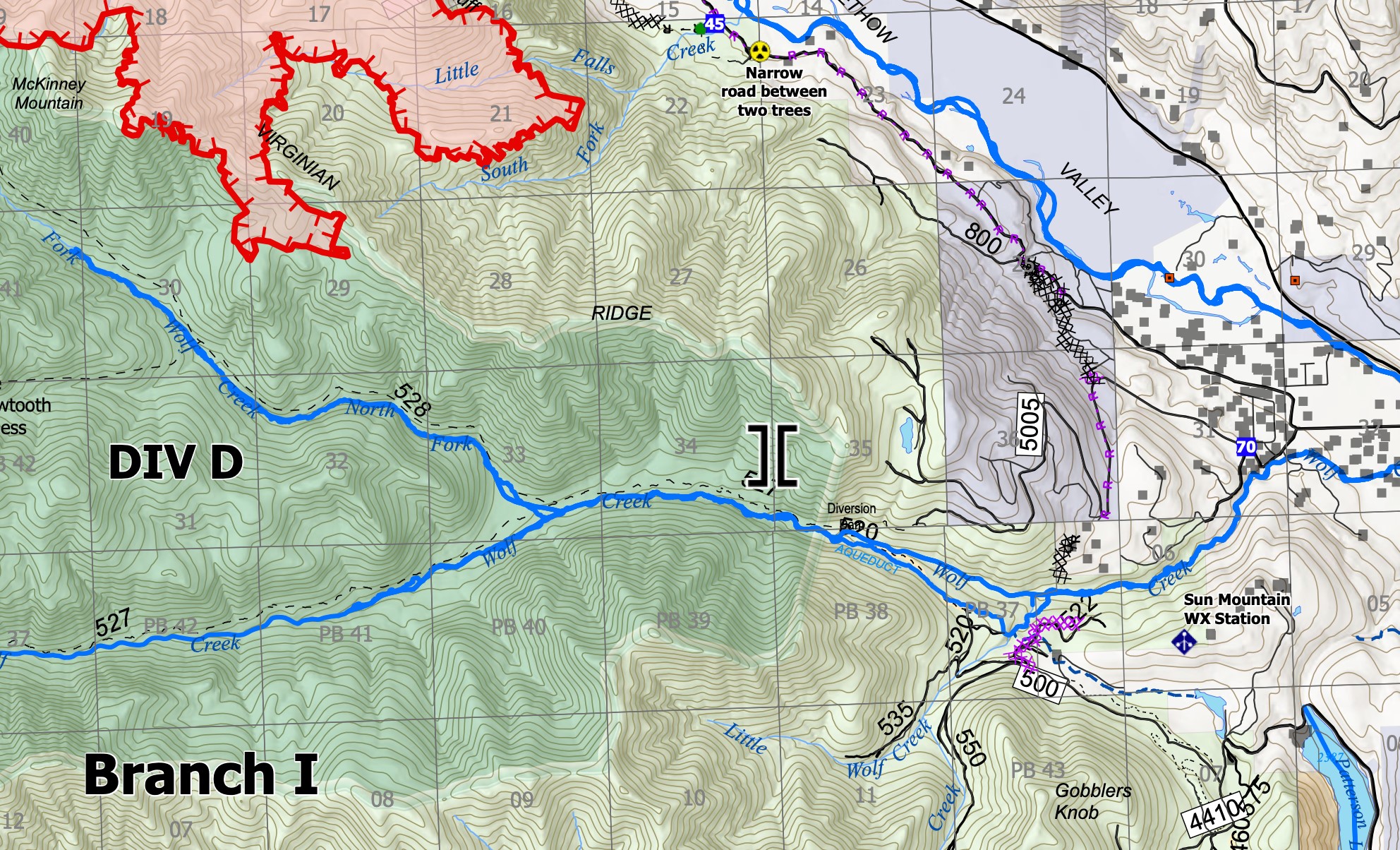 Here's a detail of the planned road and dozer line (purple R and X) on Virginian Ridge and across Wolf Creek, as of 7/22.