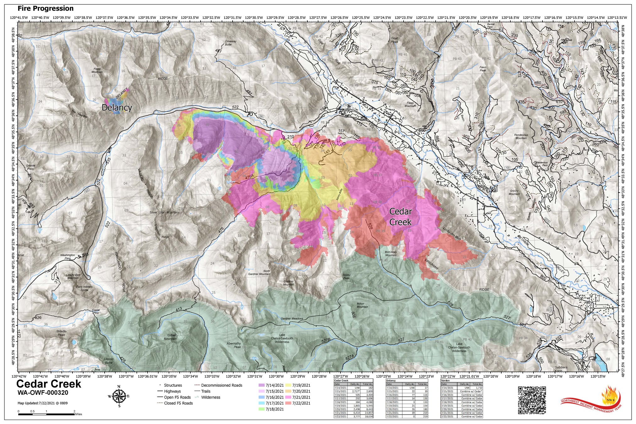 Fire Information Line - Cedar Creek and Delancy Fires: 509-557-0740 (8:00 am to 8:00 pm)