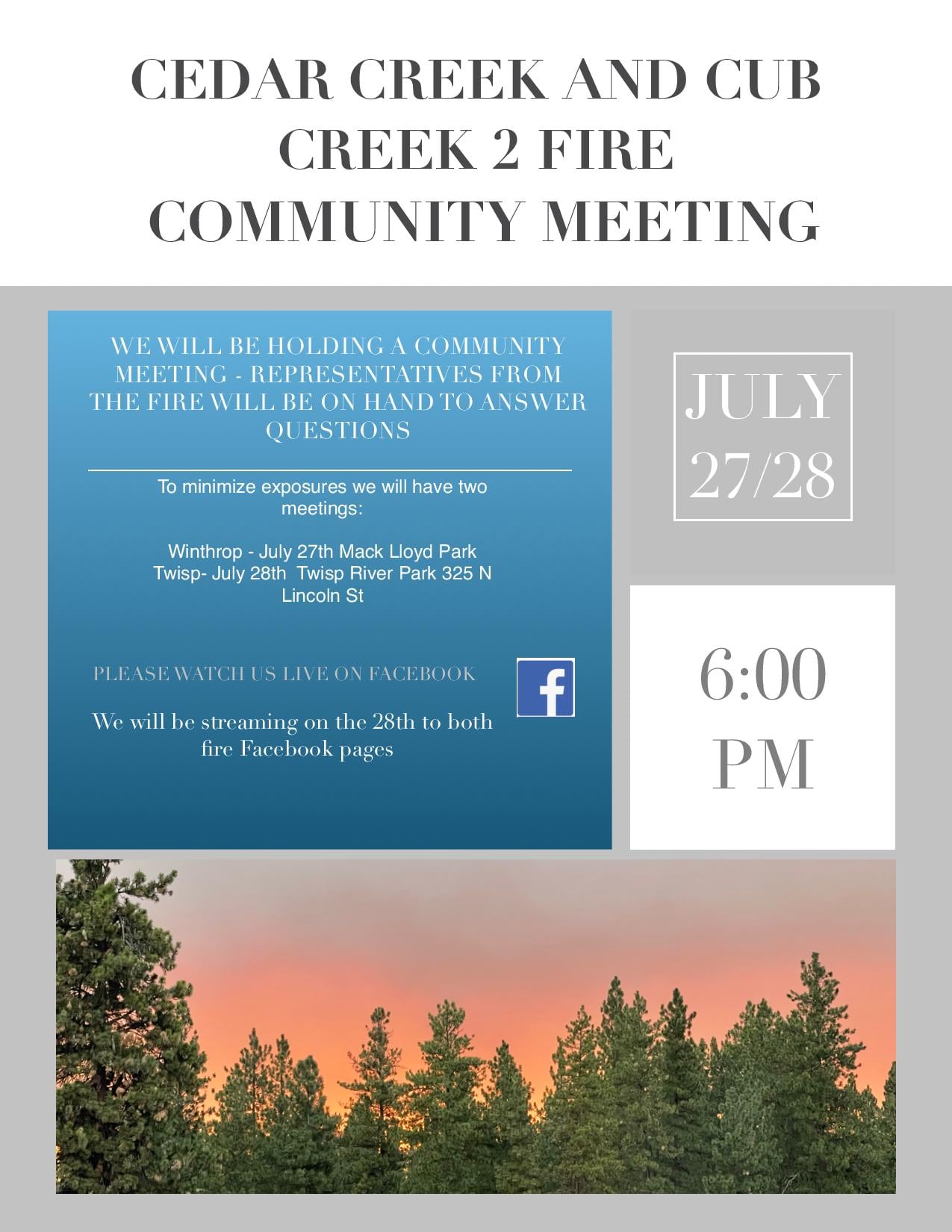 There will be two community meetings this week for both the Cedar Creek/Cub Creek 2 Fire (both meetings will be the same). On Tuesday the 27th, the meeting will be in Winthrop at Mack Lloyd Park at 6:00 pm. On Wednesday the 28th, the meeting will be in Twisp at the Twisp River Park at 325 N Lincoln Street at 6:00 pm. The 28th meeting will be live-streamed on both Fire Facebook pages: here is a link to the Cub Creek 2 one:(Cub Creek 2 Fire-2021)https://www.facebook.com/CubCreek2Fire2021