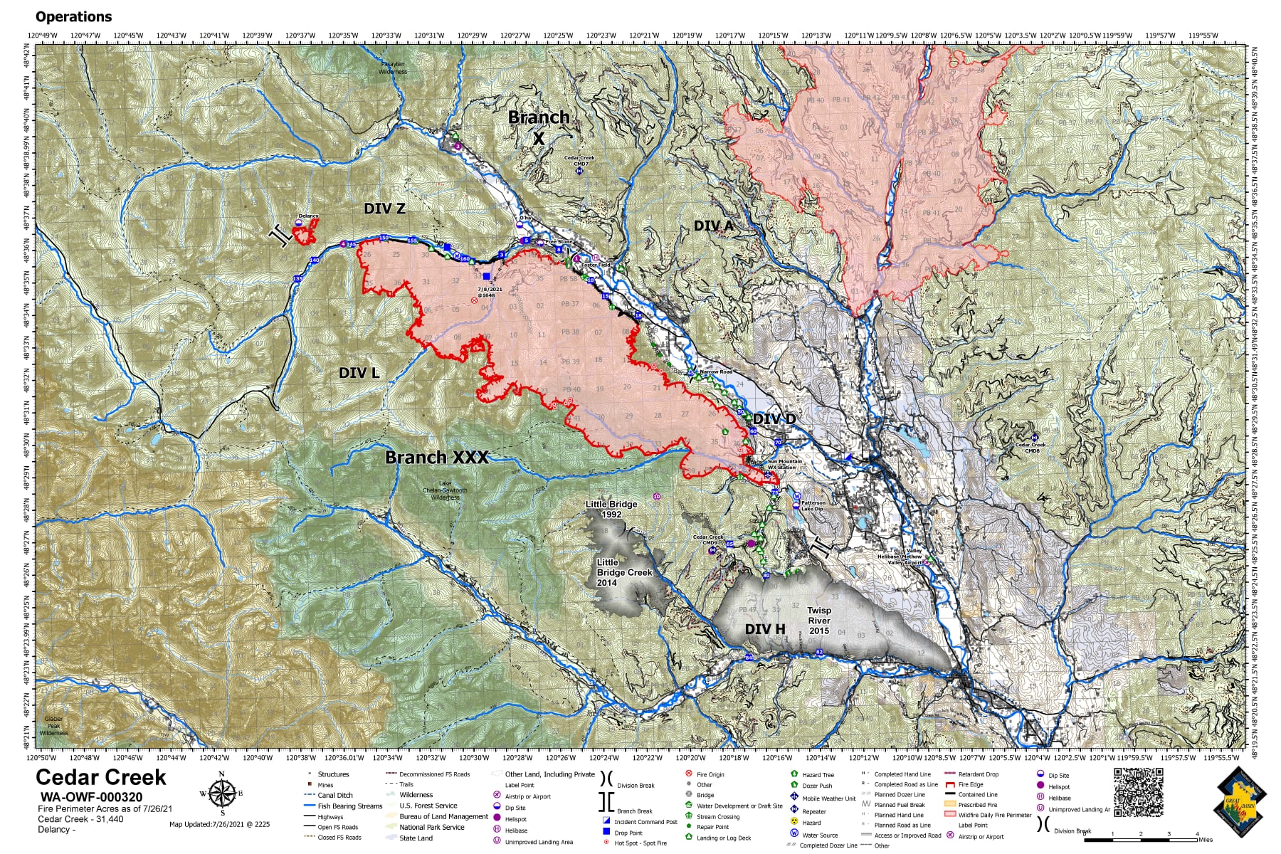 Cedar Creek Fire: The fire is currently estimated at 24,647 acres and 11% contained. Great Basin Team 1 and California Team 1 will be holding a joint public meeting tomorrow, Tuesday, July 27, at Mack Lloyd Park in Winthrop at 6 p.m. covering the Cedar Creek, Delancy and Cub Creek 2 Fires. An identical meeting with the same information will be replicated Wednesday, July 28 at Twisp River Park, 325 N Lincoln St. in Twisp at 6 p.m.