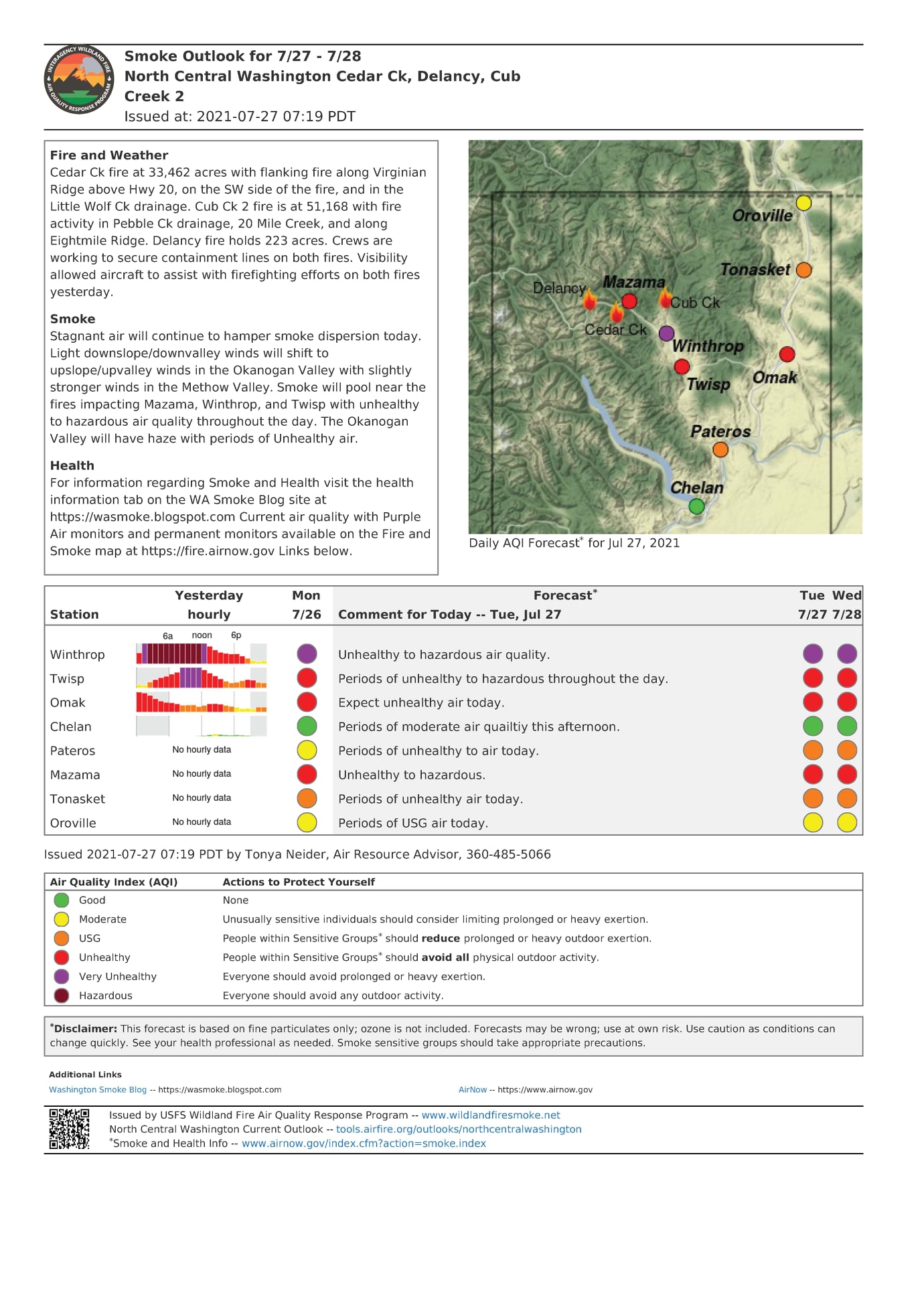 Public Meeting: Great Basin Team 1 and California Team 1 will be holding a joint public meeting tomorrow, Tuesday, July 27, at Mack Lloyd Park in Winthrop at 6 p.m. covering the Cedar Creek, Delancy and Cub Creek 2 Fires. An identical meeting with the same information will be replicated Wednesday, July 28 at Twisp River Park, 325 N Lincoln St. in Twisp at 6 p.m.