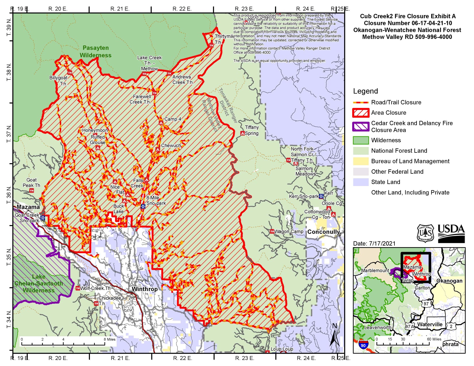 The Okanogan-Wenatchee National Forest has implemented a Fire Emergency Area Closure as of July 15, 2021. The Closure includes facilities, roads, and trails. The Closure may be viewed in its entirety at the “Cedar Creek and Delancy Fires 2021” Facebook page.