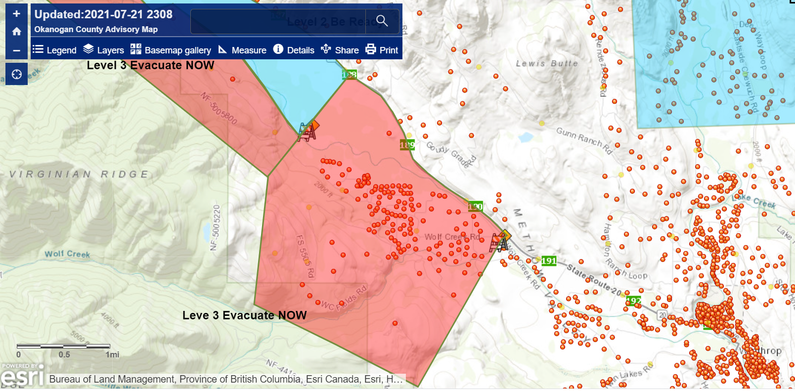 Evacuation Information: The Okanogan County Emergency Management (OCEM) continues to reevaluate evacuation levels. For the most up to date evacuation levels see the OCEM’s website above. Residents entering Evacuation Level 3 areas need to slow down and watch for firefighters and equipment in roadways.
