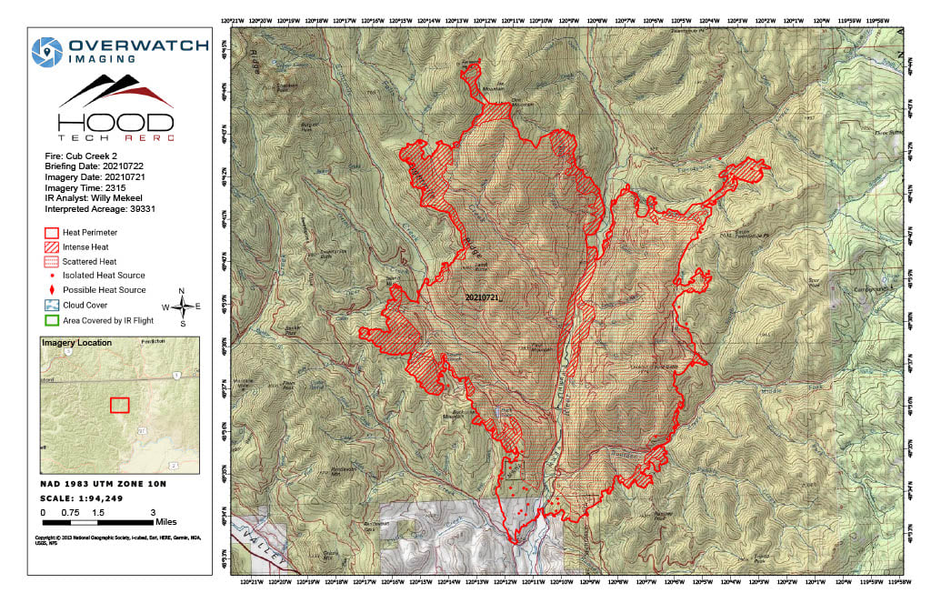 Winthrop, WA — Cub Creek 2 – The Cub Creek 2 Fire is estimated at 32,473 acres with 5% containment. The fire is burning northward with lateral growth east and west influenced by diurnal winds. Fire growth has been consistent for several operational periods at ¼ mile per hour. Firefighting efforts have benefited in areas where the fire has merged into past burned areas and areas that have received previous fuel treatments.
