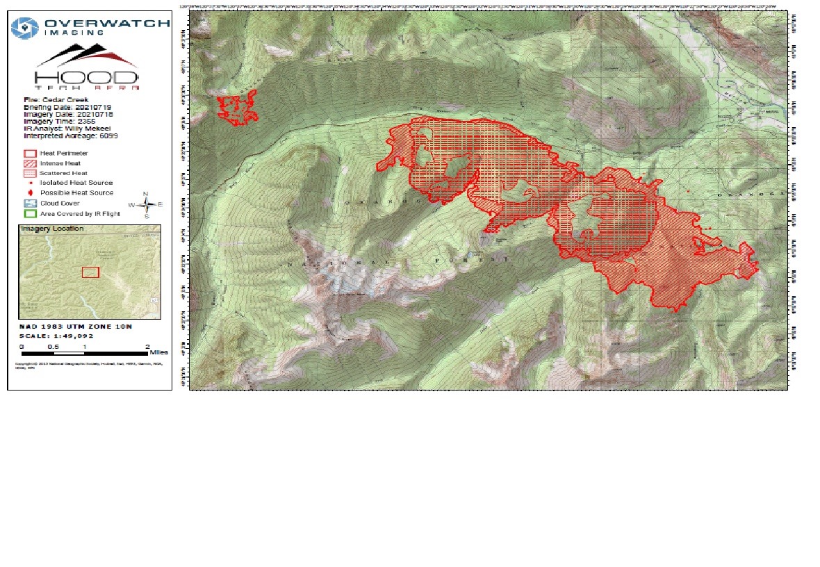 Good morning, here is a link to a website with a live streaming cam looking SW towards Sandy Butte and the Cedar Creek Fire. This camera runs 24/7 https://www.mazamatrailhead.com/p/web-cams.html