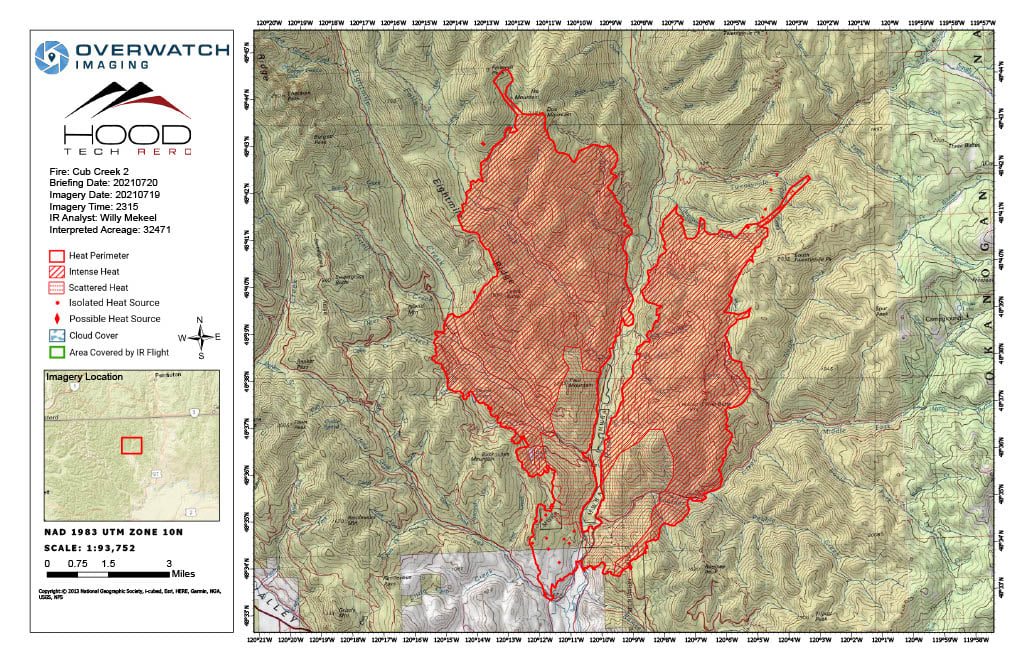 Winthrop, WA — Cub Creek 2 – The fire remains split into two arms and continued to grow actively to the north and northeast into the evening hours. The east arm has burned over Valley Creek and is approximately 1 mile from First Butte Lookout. The objective is to keep the fire from moving out of the Boulder Creek drainage. The west arm is burning northeasterly paralleling the Chewuch River where it has crossed Forest Road 5140 and is moving towards Falls Creek. The fire has reached the Eastside Chewuck Rd along the 8 Mile Ranch. The majority of the left flank of the fire is lined with dozerline from the heel of the fire to Buck Lake. The portion of this line to First Creek Road is considered contained. The south line is being reinforced to prevent spread with water resources. Multiple water dropping aerial resources including heavy lift helicopters with buckets provided support to firefighters in all locations of the fire.