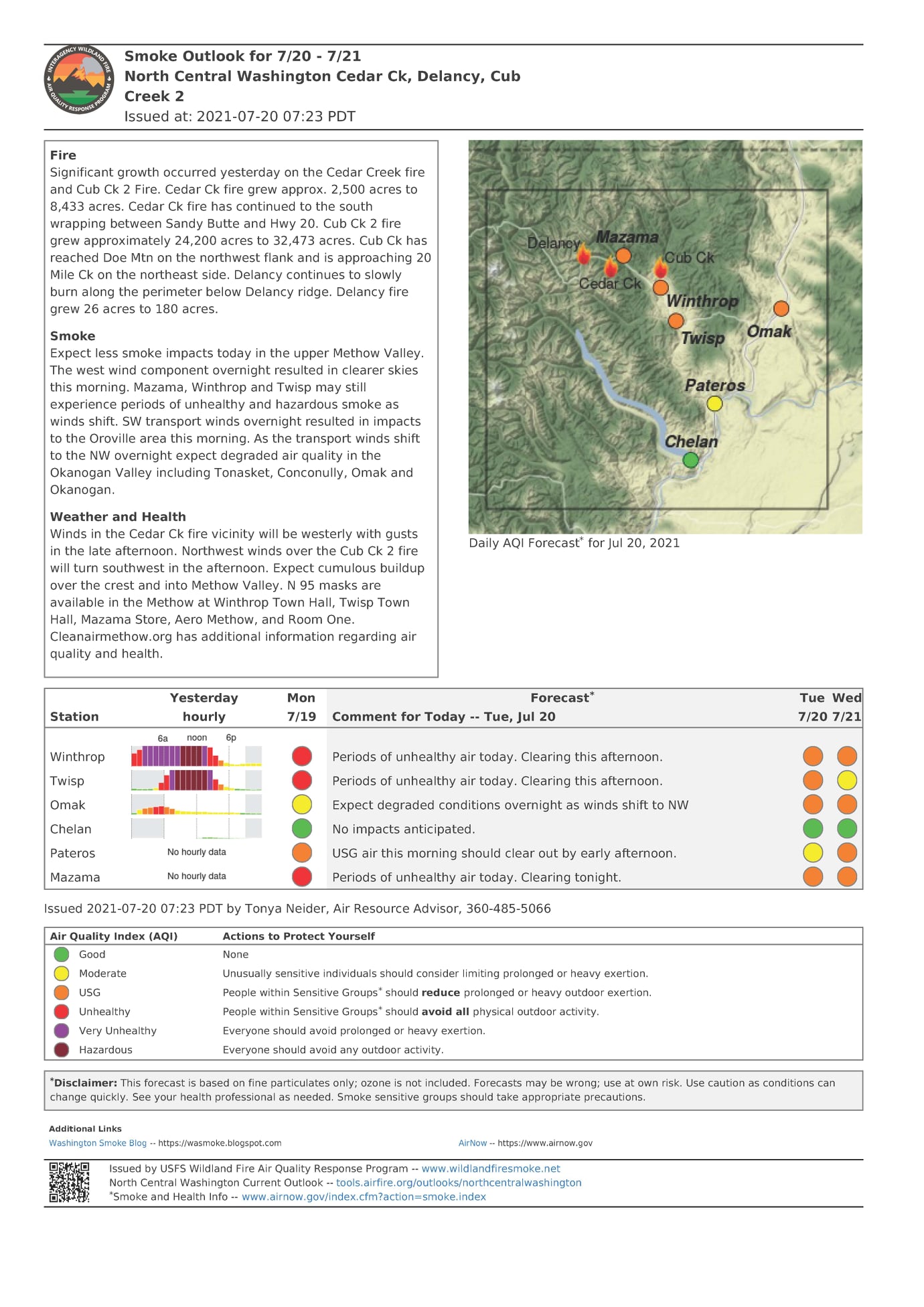 Air Quality: Expect similar smoke impacts tomorrow in the upper Methow Valley. Increased impacts will occur in the lower Methow Valley and the Columbia River drainage toward Omak. Smoke will settle into valleys overnight resulting in unhealthy to hazardous air in Winthrop and Mazama between 4:00 am to mid-afternoon. Mazama may be worse due to increased fire activity yesterday and west winds this afternoon. Please monitor the air quality on the incident FB page above and the WA Smoke Blog and take appropriate actions. All vehicle traffic is advised to travel with lights on for safety.