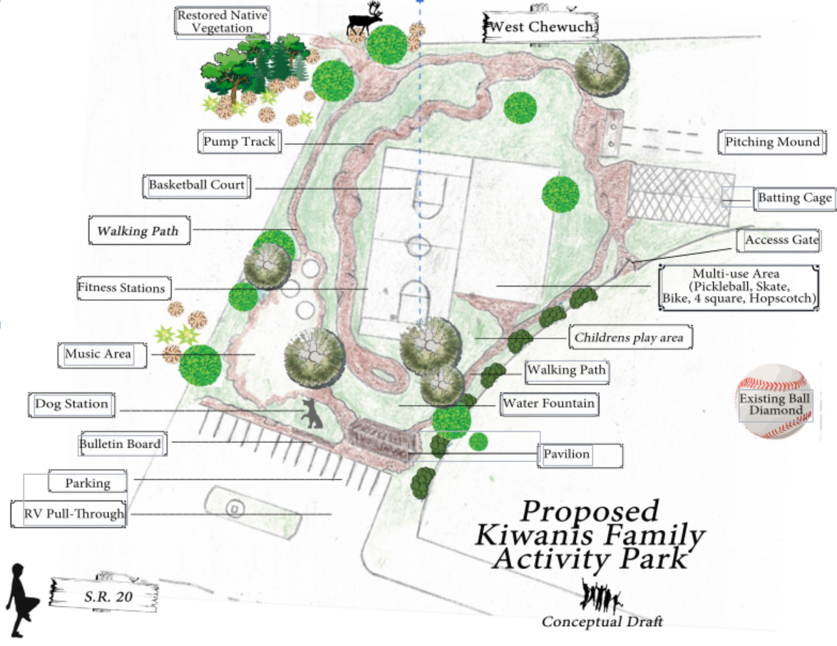 Other improvements included in the Kiwanis plan outlined in 2020 include a batting cage and pitching mound; irrigation and additional plantings; walking trails connecting activity areas and continuing up the hill to West Chewuch road; upgrades to the existing pump track; a pavilion for shade, rain protection and picnic tables; a children’s play area with fun and safe rides; fitness stations; music play area; a water fountain and bottle-fill station; a centerfield door from the existing ball field to the batting cage and pitching mound area; patching and sealing the existing basketball court and skating/pickleball/hopscotch area; a doggie station and bulletin board for community events and announcements; and parking to include an RV pull-through.