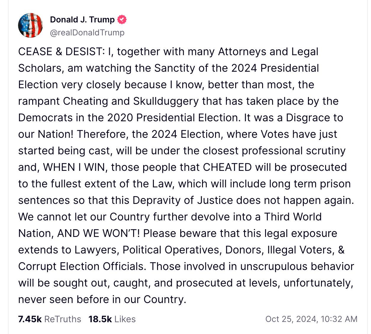 Mr. Trump, in a recent Truth Social post, has said that he intends to prosecute people who have donated to Harris or other opposition groups if he wins. This isn't the first time he's made that threat.