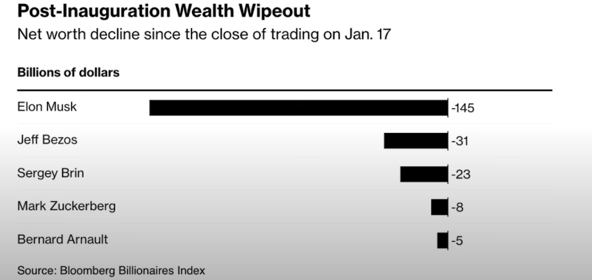 So Elon Musk has personally lost $145 billion dollars since January 17th. And Tesla shareholders are rightly pissed off, as Tesla stock is down 47.6% since inauguration day.