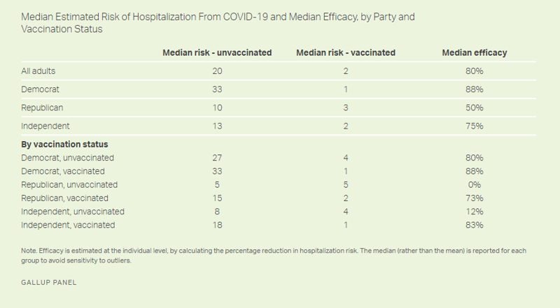 Gallup’s number derives from some wildly varying estimates of the hospitalization rates for vaccinated and unvaccinated people. For example, Democrats tend to oversell the danger to unvaccinated people, with a plurality wrongly believing at least half require hospital care. (This is why Gallup uses medians rather than averages.) But on balance, when you look at the relative numbers, the median American gets the benefit of vaccines about right.