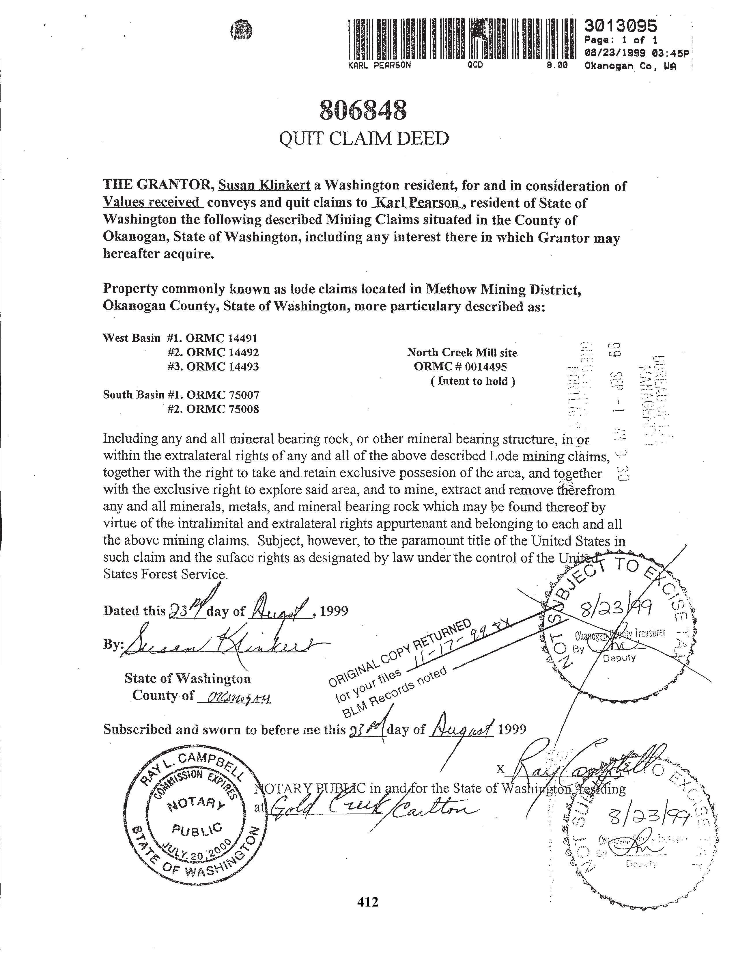TREASURE map FRANK AUSTIN gave me his mining papers TUNNEL map Wolverine Plan of operation QUIT CLAIM DEED Twisp River Org --My Active Mineral Claim Crescent Tunnel Plan of Operation