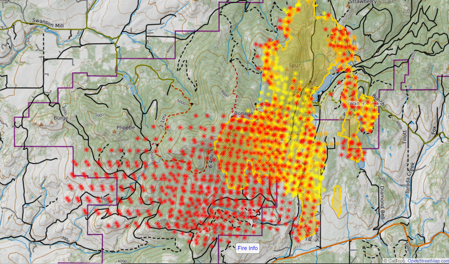 Spur Fire: Yesterday, the Spur Fire showed the most activity. Aerial resources were used to check fire growth in those active areas. Crews continue to strengthen and improve line on the northeast. Additional fireline was completed in the area of the Boy Scout camp. In addition, some firing operations were completed around the camp to strengthen the line and increase containment.