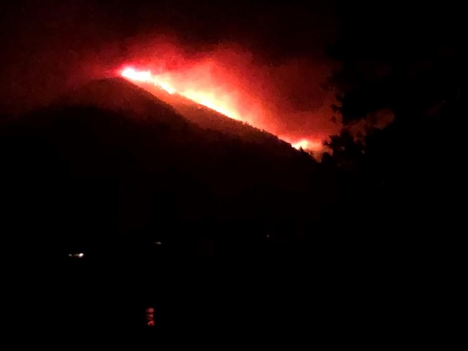 This a picture of the fire activity that was viewed from the Okanogan County Fire District 6 Mazama Station. The fire backed down the hill and prompted a Level 3 evacuation.