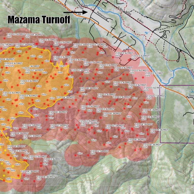 A Level 3 Immediate Evacuation (GO NOW) has been issued for the area on the State Route 20 side of the Methow River from the Mazama entrance (Lost River Road) east towards Winthrop to the Mazama Bible Camp Road. (SR 20 from Mazama to MP 182)