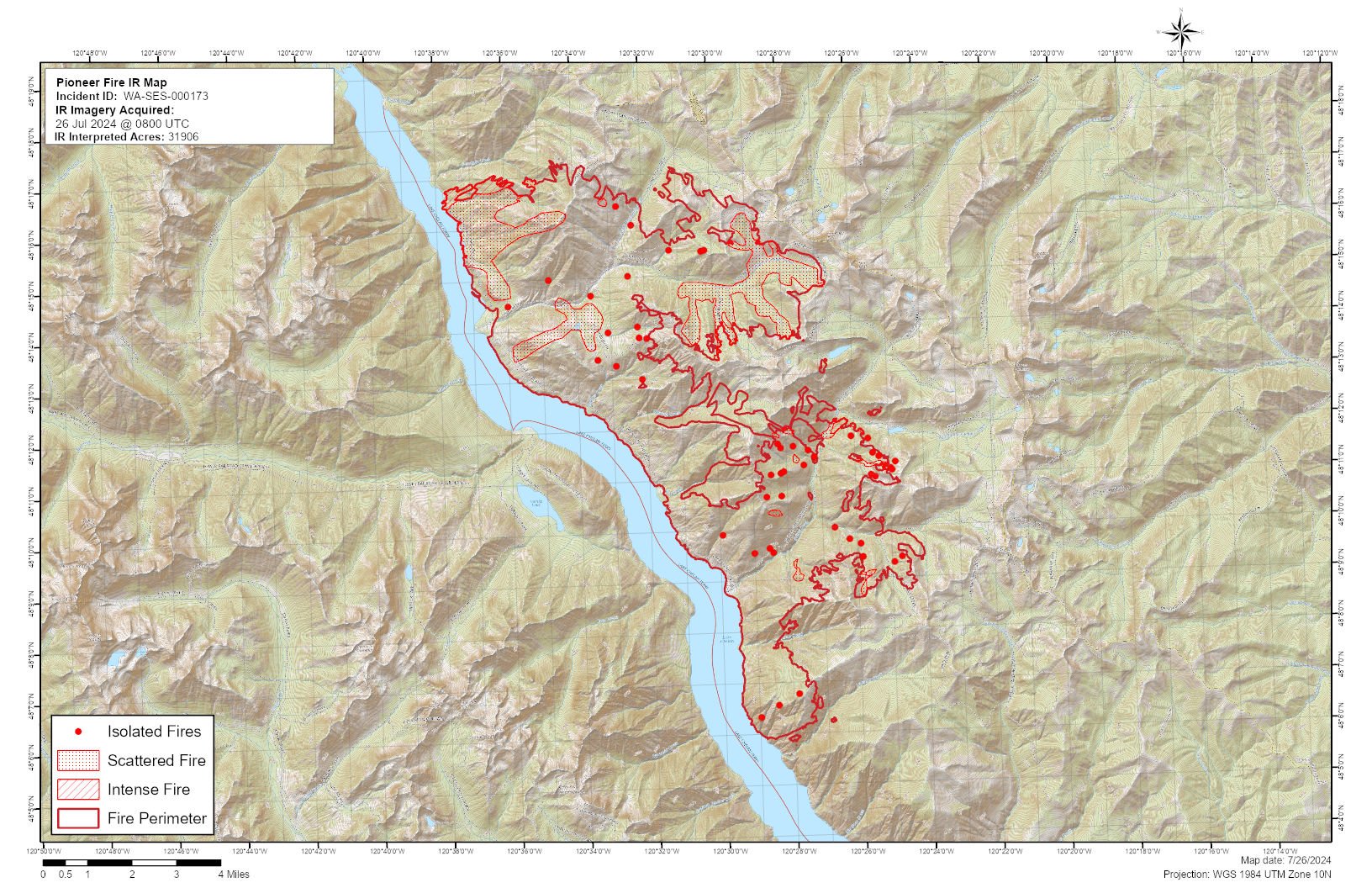 The Pioneer Fire crossed Fourmile drainage yesterday and progressed further north. This fire movement has prompted @Chelan County Emergency Management to issue a Level 3 (Go Now) notice for Stehekin starting July 28 at 8am. For more details about the notice and transport information see https://www.facebook.com/CCSOEM/posts/p ... PUJTBzqTTl