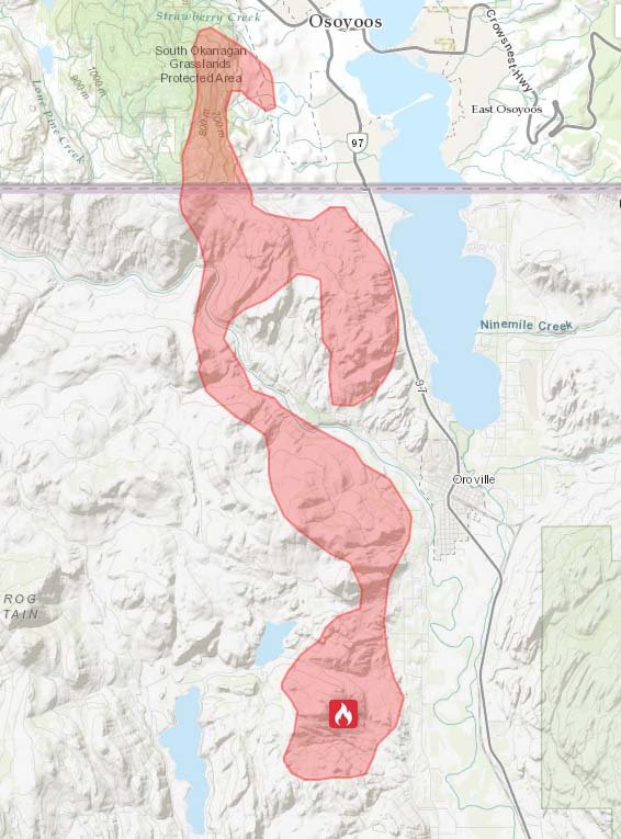 The fire is burning just west of Oroville, Wash. on lands managed by the Washington Department of Natural Resources and the Spokane District – Bureau of Land Management and has crossed into Canada.