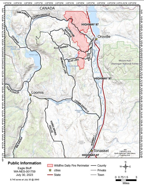 As of 10 AM Tuesday August 1, 2023 the Eagle Bluff Fire burning near Oroville WA. is estimated at approximately 15,349 acres.
