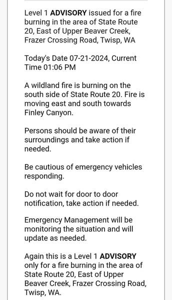 LEVEL 1 FIRE ADVISORY FOR SR20 EAST OF UPPER BEAVER CREEK AND FRAZER CROSSING ROAD IN TWISP.