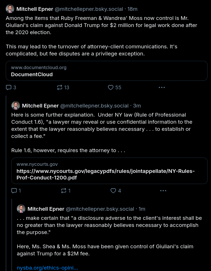 The sweet part about awarding donnie’s debt is that debt collection for a lawyer does an end-run around attorney-client privilege. As the two women pursue collection, the court gets to look at what Rudy and donnie were up to in order to generate a bill that large! Donny might wanna settle just to keep that from actually getting to court and raising some uncomfortable issues.