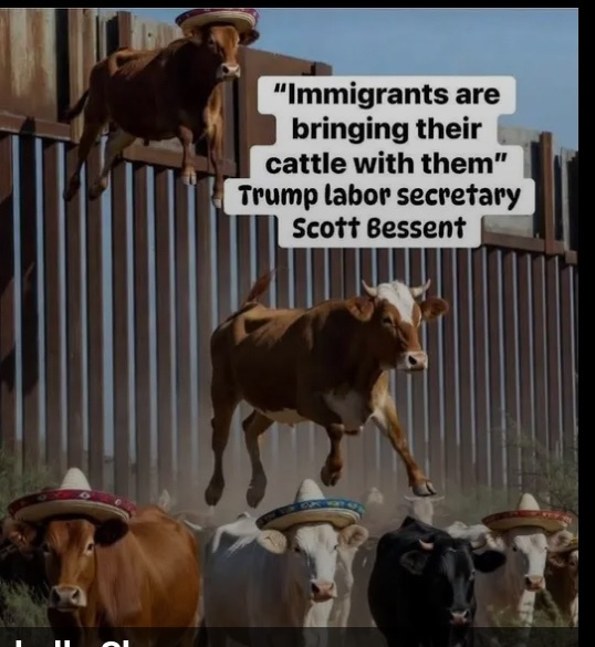 SB: "telling Fox that the reason beef prices are so high is because immigrants from South America are bringing their cattle (on leashes) from South America with them as they come here and they are infected with diseases.