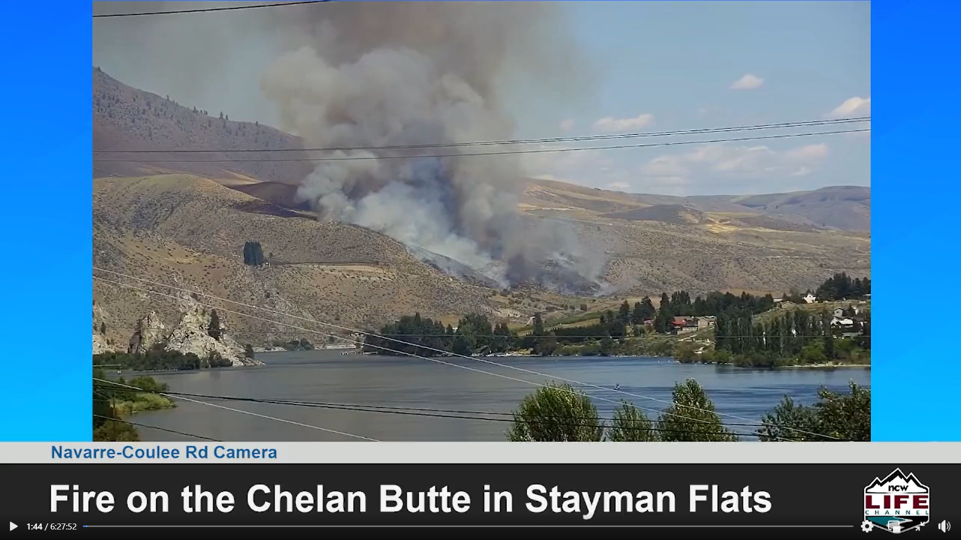 Update 7/18 at 4:25 pm: Fire department responded to report of 2 brush fires in the same general area. Dept of Natural Resources is calling it the Staymen Flate fire located about 5 miles south west of Chelan. Early reports indicate approximately 35 acres. Ground and air resources are on the scene from multiple agencies. Stayman Flats Road is closed to traffic.