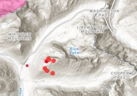 Location: Near Blue Lake just a couple miles southwest of Washington Pass, 13 miles southwest of Mazama, and 24 miles west of Winthrop, WA