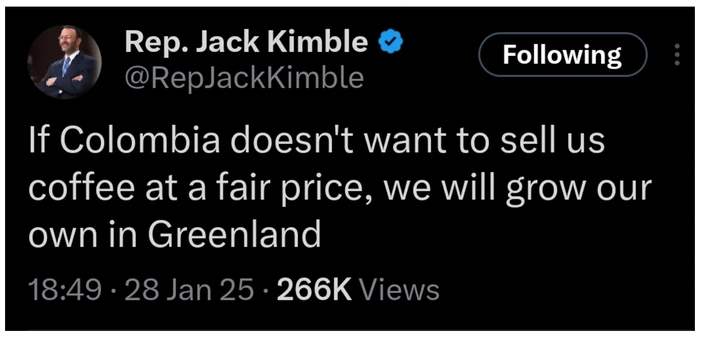 My understanding is the Trumptards are now saying we can grow our own coffee in Greenland.
