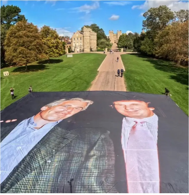 Some 1700+ people paid for this giant banner of Epstein and Dwindling, pee-pants, FELON donnie to be unrolled in front of Windsor Castle - to greet him today.