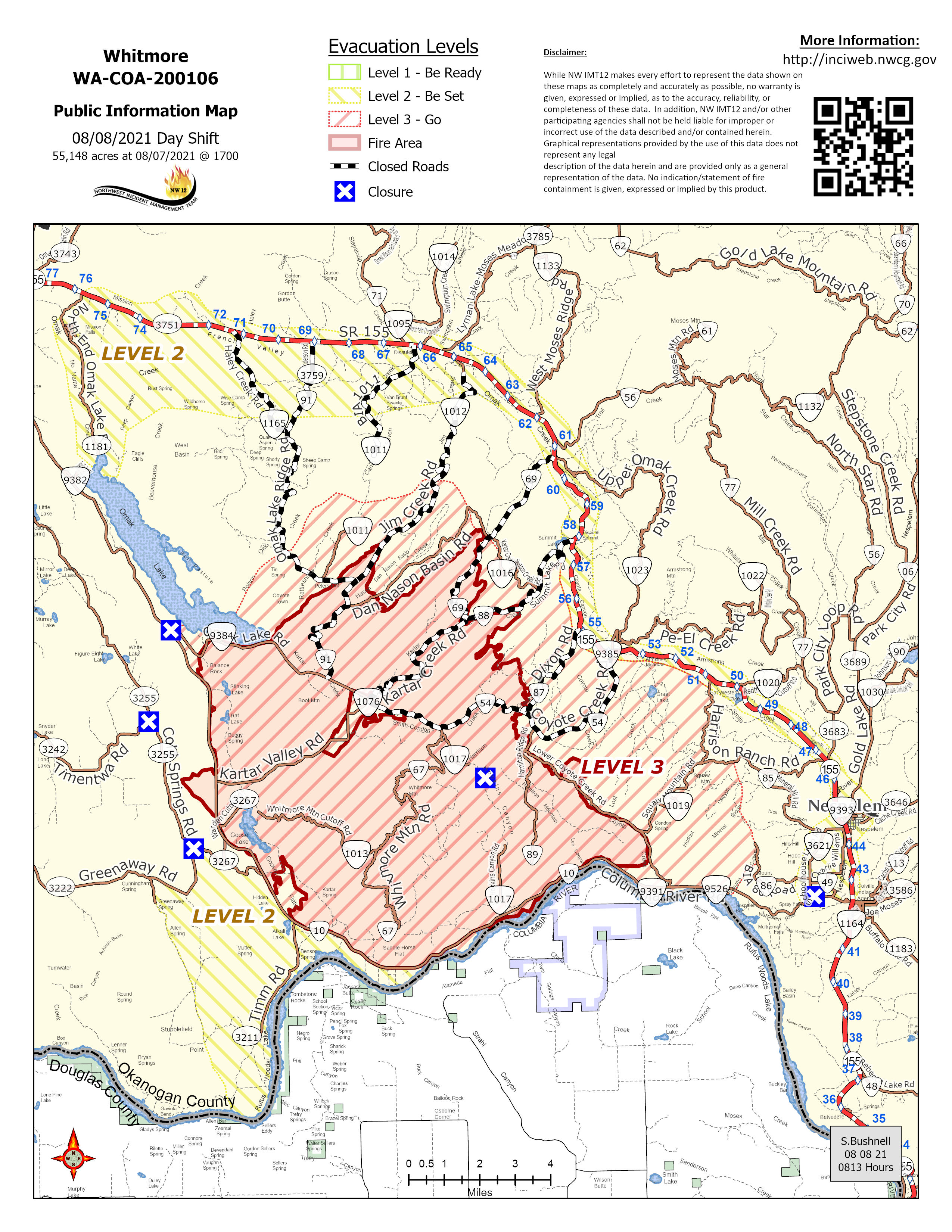 Level 2 evacuations are still in place for the Columbia River Road corridor, Kartar Valley, Colville Agency, the community of Nespelem, and the SR155 corridor from Colville Agency north up to the Mission.
