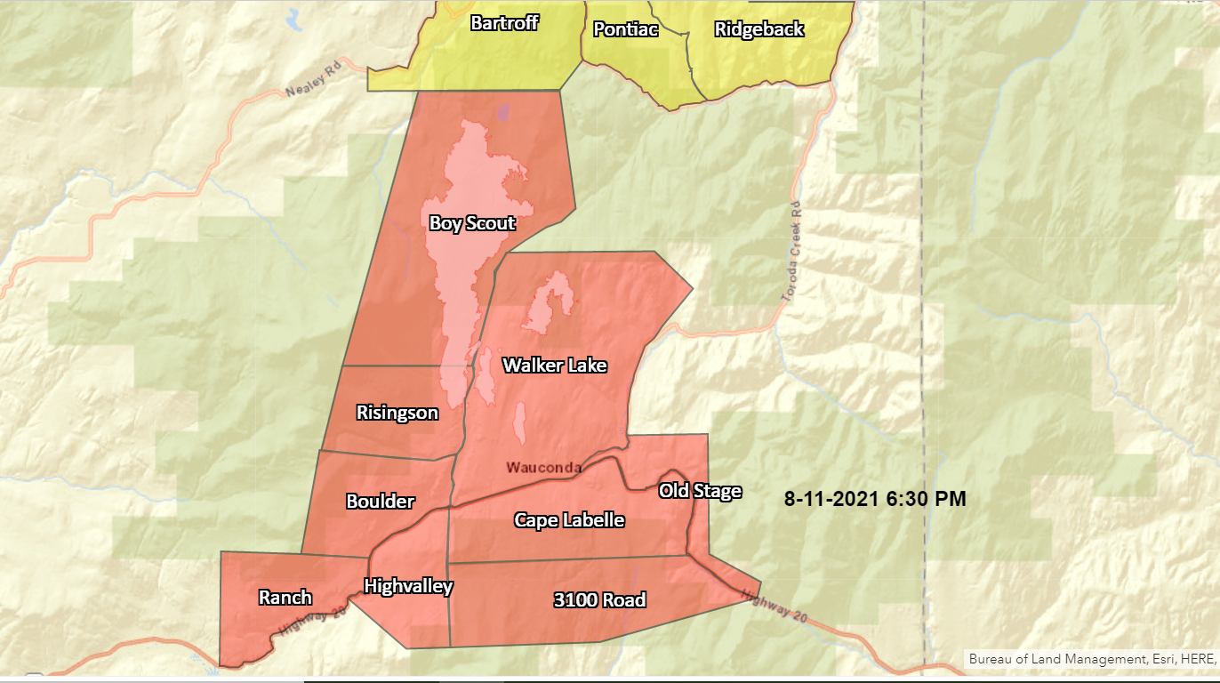 Walker Creek Fire: A RED FLAG WARNING is in effect today for low humidities and gusty winds from the west and southwest. Fire behavior is expected to be active today. Crews will be strongly focusing on structure protection and strategically placing resources around the fire area in anticipation of today’s fire behavior. Structure protection will continue in the area of the Boy Scout camp and east of the Bonaparte Lake Road. On the southeast side crews will be doing further structure protection and patrolling for spot fires along the Bunch Road. Overnight, additional structure protection was done in the Walker Lake area and day shift crews will continue that work today. On the southwest side of the fire crews will be patrolling the south side of the 3230 road for spot fires. Fireline construction and improvement will be done to tie in to the Bonaparte Lake Road from the 3230 road.