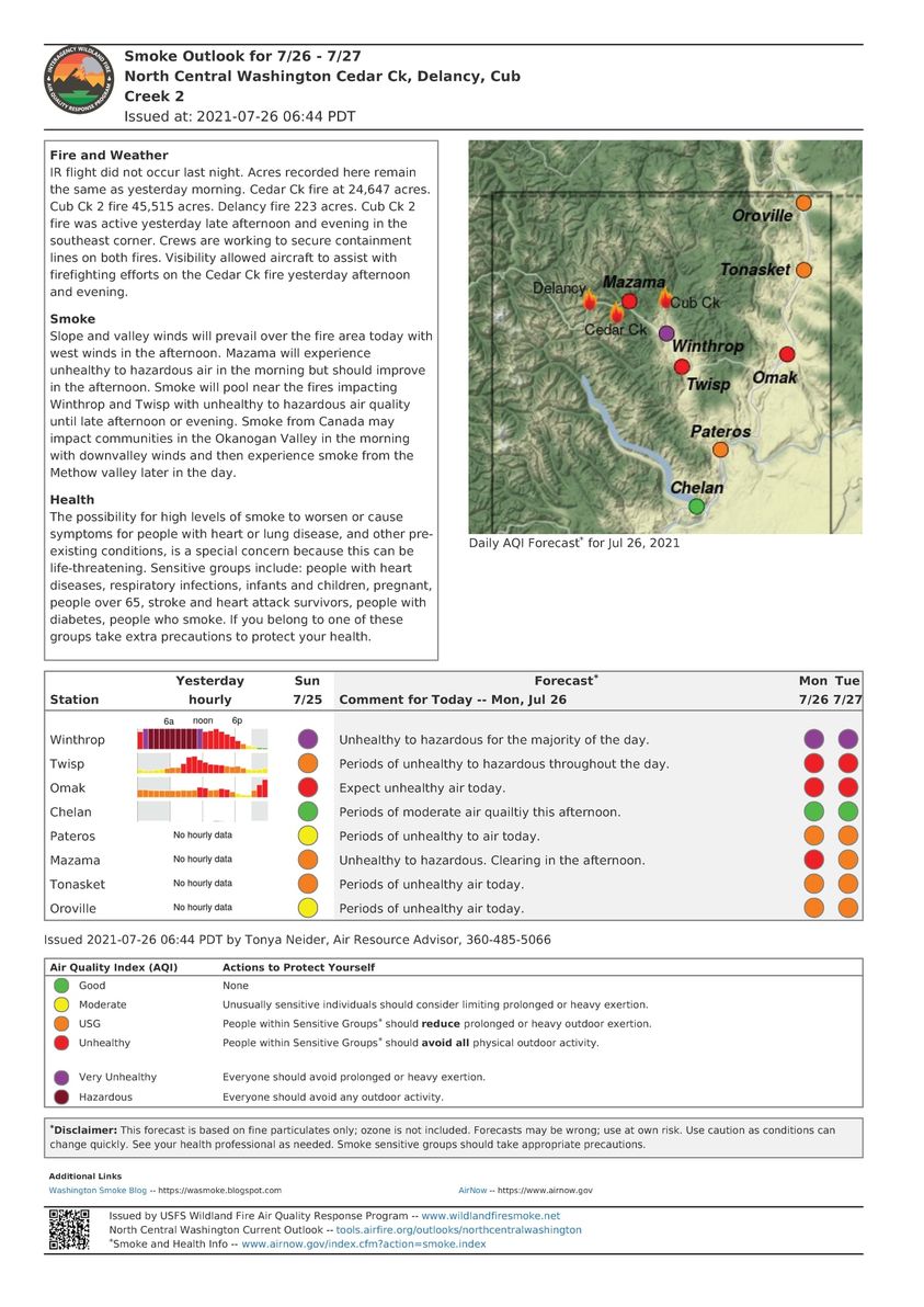 Slope and valley winds will prevail over the fire area today with west winds in the afternoon. Mazama will experience unhealthy to hazardous air in the morning but should improve in the afternoon. Smoke will pool near the fires impacting Winthrop and Twisp with unhealthy to hazardous air quality until late afternoon or evening. Smoke from Canada may impact communities in the Okanogan Valley in the morning with downvalley winds and then experience smoke from the Methow valley later in the day.