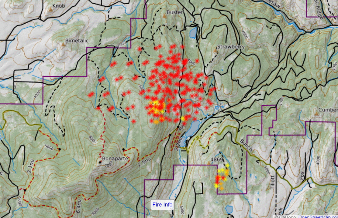 Well here’s the update: New fire, on Spur mountain. we watched all day as it burned down the ridge. It’s following 100 rd. We were evacuated due to risk of spot fires. It’s hot and heavy with years of fuel built up. There was heavy air support until dark. No ground crews yet, very dangerous terrain and the firefighters are stretched so thin. We will continue to provide updates. At the rate this was moving, we are hoping it goes by us. we are taking it day by day and contacting people with reservations up to 2 days ahead. Praying for everyone’s safety.