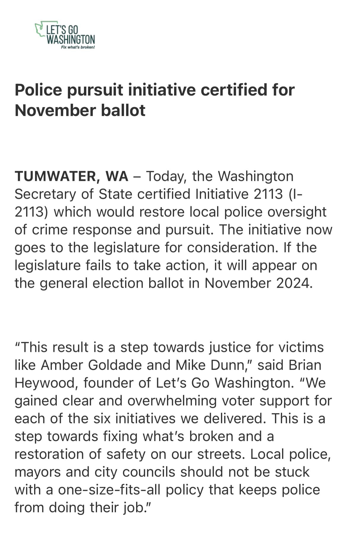 Initiative 2113 to restore reasonable police pursuits has been certified.