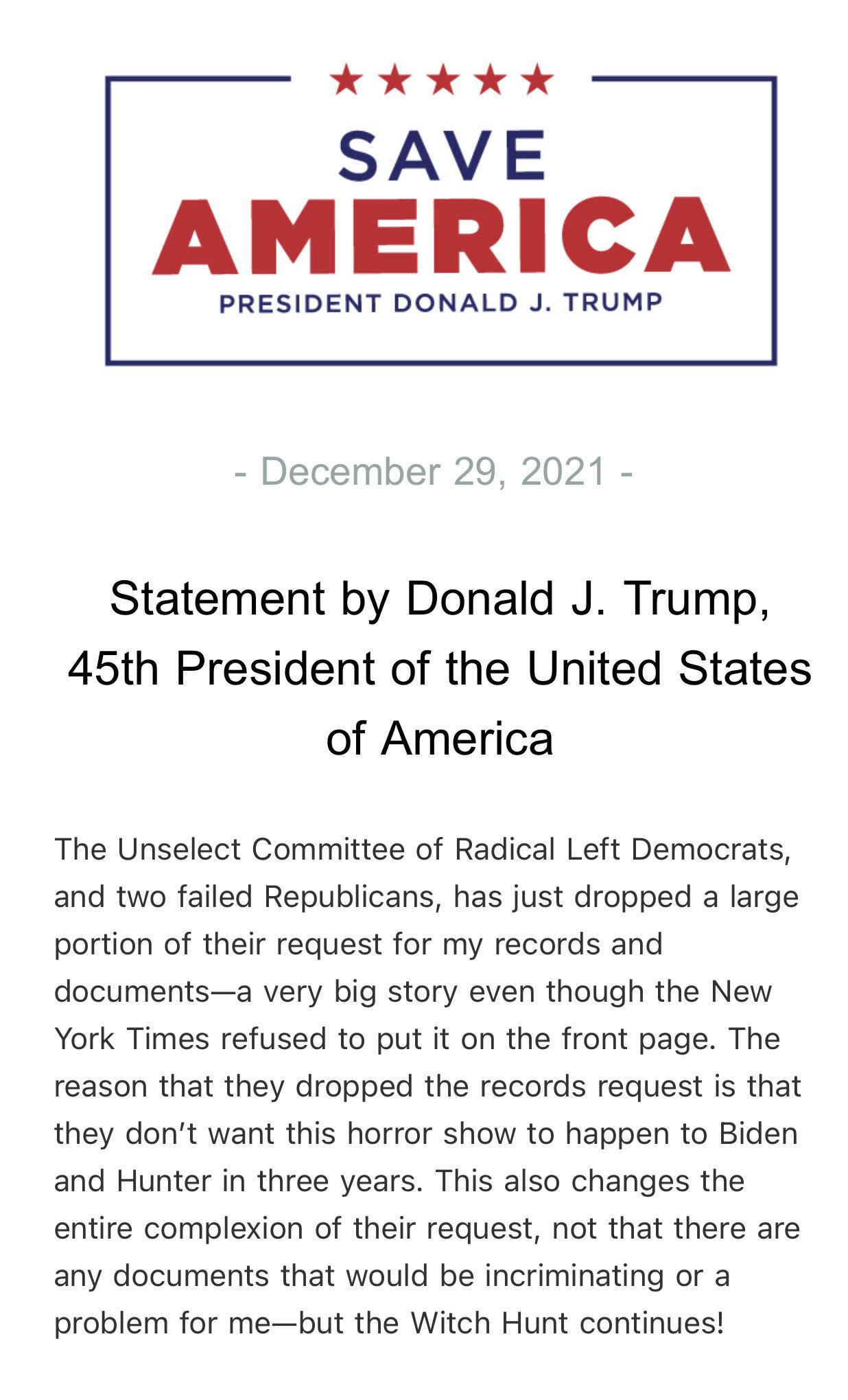 ⁩ hasn’t dropped requests for any necessary records. In fact, we’re actively litigating to obtain White House records Trump is trying to conceal. We will not allow him to hide the truth about January 6th, or his conduct, from the American people.