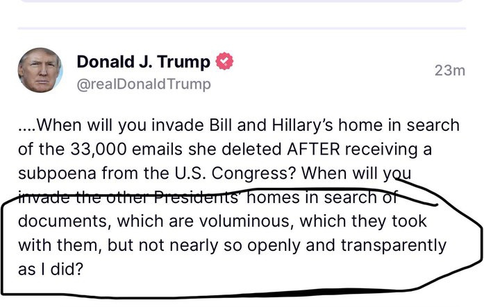 Always interesting to see Trump openly admit to his theft of govt property. Of course his claim of other presidents stealing or HRC's emails is never brought up as a defense by any of his lawyers once they step foot inside a courtroom or in any of their filings. They aren't allow to lie before a judge/they aren't allowed to bring frivolous cases or conspiracy distractions and so they are left with the indefensible status of these cases. Trump, is all alone in his lawbreaking, there are no 'other' presidents or Democrats to share that stage with him.