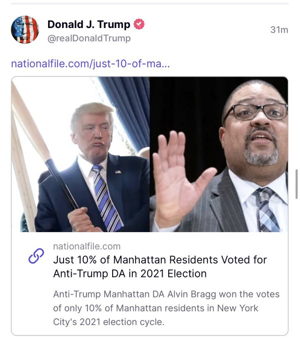 What makes Trump's recent pic of the bat as a threat to Bragg unusual is that he is personally threatening Bragg, he's not just calling his base to be violent (which he is) he's stepping up his own direct threat.